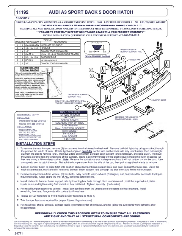 However you define adventure -- whether it's climbing onto the back of a mountain bike, hunting from the top of a tree stand or camping with the family a long way from nowhere -- CURT class 1 hitches provide a light-duty towing receiver to help you Bring It. Each is made to fit a specific vehicle, providing easier installation, a better fit and optimal towing capacity. Custom class 1 trailer hitches are available for a variety of smaller vehicle types, including the compact car, crossover, minivan and small SUV. This particular class 1 hitch is designed to be a custom hitch for certain years of the Audi A3 (to verify vehicle compatibility, see the CURT application guide at curtmfg.com). Tested in accordance with SAE J684, it offers a weight carrying capacity of 2,000 lbs. GTW and 200 lbs. TW. It is equipped with 1-1/4" receiver tube opening to accept a ball mount shank or other hitch mount. This class 1 hitch also comes with all necessary mounting hardware. With its lightweight design and smaller receiver tube size, a class 1 hitch is especially useful for adding cargo space with a hitch-mounted bike rack or cargo carrier. They can also typically be used to tow small trailers such as a utility trailer, kayak trailer or teardrop camper (never exceed the lowest weight capacity of any towing component; i.e. the vehicle, hitch, trailer, etc). Though CURT class 1 trailer hitches are only intended for light-duty towing, we apply the same principles of quality as we do to the rest of our rear mount hitches. Each class 1 hitch is made with hands-on engineering, high-strength steel and precise welding. We use a co-cured finish of liquid A-coat, inside and out, and durable black powder coat to provide a lasting defense against rust, chips and UV rays.