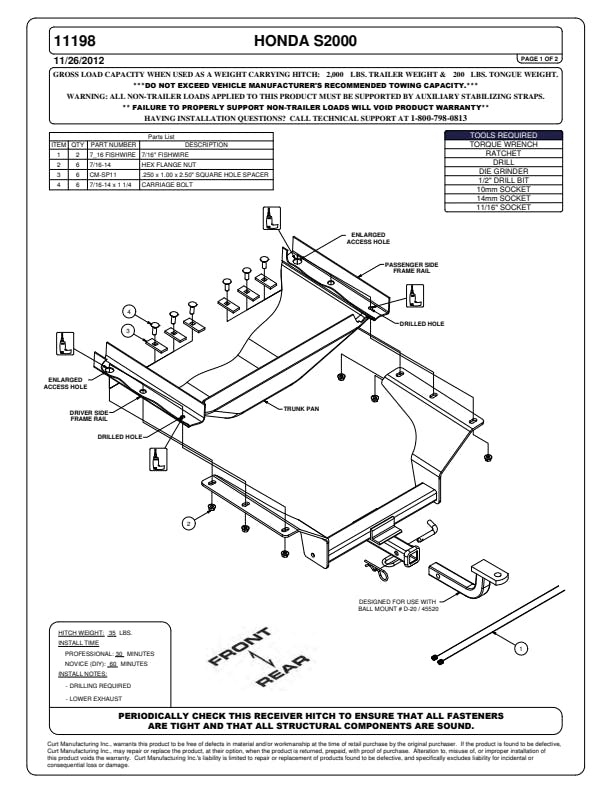 Connect to your lifestyle with a custom hitch receiver from CURT. All of our custom hitches are designed for a vehicle-specific fit, manufactured with pride, finished for industry-leading rust resistance and tested to rigorous SAE J684 standards for safety. This class 1 trailer hitch and ball mount combination is designed for a custom fit on select years of the Honda S2000 (see application info to verify fitment). The hitch integrates with the vehicle's frame and provides a useful and dependable 1-1/4" x 1-1/4" receiver. The receiver is perfect for attaching the included ball mount and towing a small trailer, or for adding cargo space with a hitch-mounted cargo carrier, bike rack or other accessory. This particular class 1 hitch is rated for 2,000 pounds gross trailer weight and 200 pounds tongue weight (never exceed the lowest-rated towing component). The ball mount included with this trailer hitch quickly and easily installs into the hitch receiver and has a 3/4" trailer ball hole (trailer ball not included). It can be mounted in the rise or drop position to promote level towing. Like all CURT custom hitches, this class 1 hitch is protected with our co-cured finishing process. It is descaled for a smooth surface, immersed in liquid A-coat for rust resistance inside and out, covered with a durable black powder coat and finally co-cured for an industry-leading rust, chip and UV-resistant shield. No matter where you're headed or which season of the year you’re towing in, this CURT hitch is equipped for long-lasting resilience to the elements. It features an open-back receiver for easy cleaning, and it comes with all the hardware necessary for the installation.