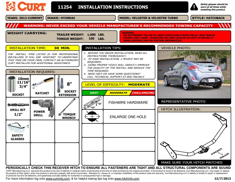 However you define adventure -- whether it's climbing onto the back of a mountain bike, hunting from the top of a tree stand or camping with the family a long way from nowhere -- CURT class 1 hitches provide a light-duty towing receiver to help you Bring It. Each is made to fit a specific vehicle, providing easier installation, a better fit and optimal towing capacity. Custom class 1 trailer hitches are available for a variety of smaller vehicle types, including the compact car, crossover, minivan and small SUV. This particular class 1 hitch is designed to be a custom hitch for certain years of the Hyundai Veloster (to verify vehicle compatibility, see the CURT application guide at curtmfg.com). Tested in accordance with SAE J684, it offers a weight carrying capacity of 1,000 lbs. GTW and 100 lbs. TW. It is equipped with 1-1/4" receiver tube opening to accept a ball mount shank or other hitch mount. This class 1 hitch also comes with all necessary mounting hardware. With its lightweight design and smaller receiver tube size, a class 1 hitch is especially useful for adding cargo space with a hitch-mounted bike rack or cargo carrier. They can also typically be used to tow small trailers such as a utility trailer, kayak trailer or teardrop camper (never exceed the lowest weight capacity of any towing component; i.e. the vehicle, hitch, trailer, etc). Though CURT class 1 trailer hitches are only intended for light-duty towing, we apply the same principles of quality as we do to the rest of our rear mount hitches. Each class 1 hitch is made with hands-on engineering, high-strength steel and precise welding. We use a co-cured finish of liquid A-coat, inside and out, and durable black powder coat to provide a lasting defense against rust, chips and UV rays.