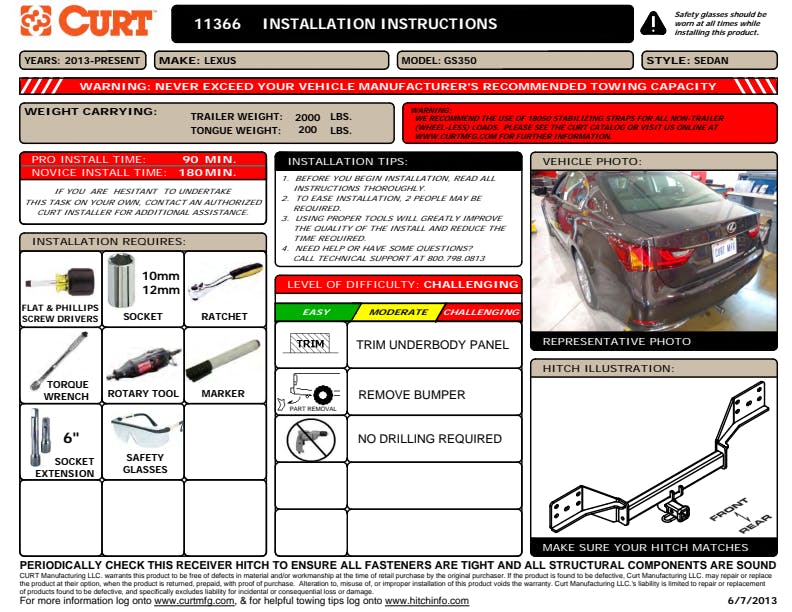However you define adventure -- whether it's climbing onto the back of a mountain bike, hunting from the top of a tree stand or camping with the family a long way from nowhere -- CURT class 1 hitches provide a light-duty towing receiver to help you Bring It. Each is made to fit a specific vehicle, providing easier installation, a better fit and optimal towing capacity. Custom class 1 trailer hitches are available for a variety of smaller vehicle types, including the compact car, crossover, minivan and small SUV. This particular class 1 hitch is designed to be a custom hitch for certain years of the Lexus GS300 and GS350 (to verify vehicle compatibility, see the CURT application guide at curtmfg.com). Tested in accordance with SAE J684, it offers a weight carrying capacity of 2,000 lbs. GTW and 200 lbs. TW. It is equipped with 1-1/4" receiver tube opening to accept a ball mount shank or other hitch mount. This class 1 hitch also comes with all necessary mounting hardware. With its lightweight design and smaller receiver tube size, a class 1 hitch is especially useful for adding cargo space with a hitch-mounted bike rack or cargo carrier. They can also typically be used to tow small trailers such as a utility trailer, kayak trailer or teardrop camper (never exceed the lowest weight capacity of any towing component; i.e. the vehicle, hitch, trailer, etc). Though CURT class 1 trailer hitches are only intended for light-duty towing, we apply the same principles of quality as we do to the rest of our rear mount hitches. Each class 1 hitch is made with hands-on engineering, high-strength steel and precise welding. We use a co-cured finish of liquid A-coat, inside and out, and durable black powder coat to provide a lasting defense against rust, chips and UV rays.
