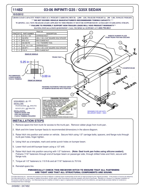 Connect to your lifestyle with a custom hitch receiver from CURT. All of our custom hitches are designed for a vehicle-specific fit, manufactured with pride, finished for industry-leading rust resistance and tested to rigorous SAE J684 standards for safety. This class 1 trailer hitch and ball mount combination is designed for a custom fit on select years of the Infiniti G35 (see application info to verify fitment). The hitch integrates with the vehicles frame and provides a useful and dependable 1-1/4 in. x 1-1/4 in. receiver. The receiver is perfect for attaching the included ball mount and towing a small trailer, or for adding cargo space with a hitch-mounted cargo carrier, bike rack or other accessory. This particular class 1 hitch is rated for 2,000 pounds gross trailer weight and 200 pounds tongue weight (never exceed the lowest-rated towing component). The ball mount included with this trailer hitch quickly and easily installs into the hitch receiver and has a 3/4 in. trailer ball hole (trailer ball not included). It can be mounted in the rise or drop position to promote level towing. Like all CURT custom hitches, this class 1 hitch is protected with our co-cured finishing process. It is descaled for a smooth surface, immersed in liquid A-coat for rust resistance inside and out, covered with a durable black powder coat and finally co-cured for an industry-leading rust, chip and UV-resistant shield. No matter where youre headed or which season of the year you're towing in, this CURT hitch is equipped for long-lasting resilience to the elements. It features an open-back receiver for easy cleaning, and it comes with all the hardware necessary for the installation.