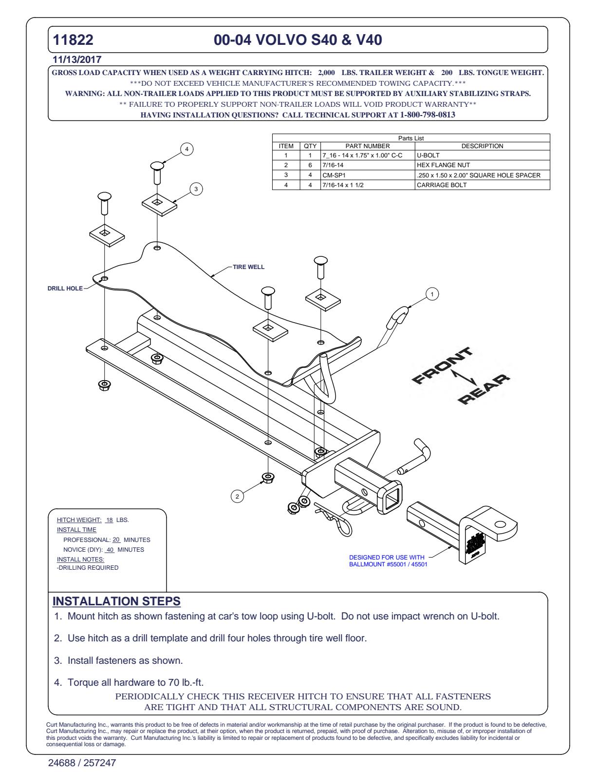 Connect to your lifestyle with a custom hitch receiver from CURT. All of our custom hitches are designed for a vehicle-specific fit, manufactured with pride, finished for industry-leading rust resistance and tested to rigorous SAE J684 standards for safety. This class 1 trailer hitch and ball mount combination is designed for a custom fit on select years of the Volvo S40 and V40 (see application info to verify fitment). The hitch integrates with the vehicle's frame and provides a useful and dependable 1-1/4" x 1-1/4" receiver. The receiver is perfect for attaching the included ball mount and towing a small trailer, or for adding cargo space with a hitch-mounted cargo carrier, bike rack or other accessory. This particular class 1 hitch is rated for 2,500 pounds gross trailer weight and 200 pounds tongue weight (never exceed the lowest-rated towing component). The ball mount included with this trailer hitch quickly and easily installs into the hitch receiver and has a 3/4" trailer ball hole (trailer ball not included). It can be mounted in the rise or drop position to promote level towing. Like all CURT custom hitches, this class 1 hitch is protected with our co-cured finishing process. It is descaled for a smooth surface, immersed in liquid A-coat for rust resistance inside and out, covered with a durable black powder coat and finally co-cured for an industry-leading rust, chip and UV-resistant shield. No matter where you're headed or which season of the year you’re towing in, this CURT hitch is equipped for long-lasting resilience to the elements. It features an open-back receiver for easy cleaning, and it comes with all the hardware necessary for the installation.