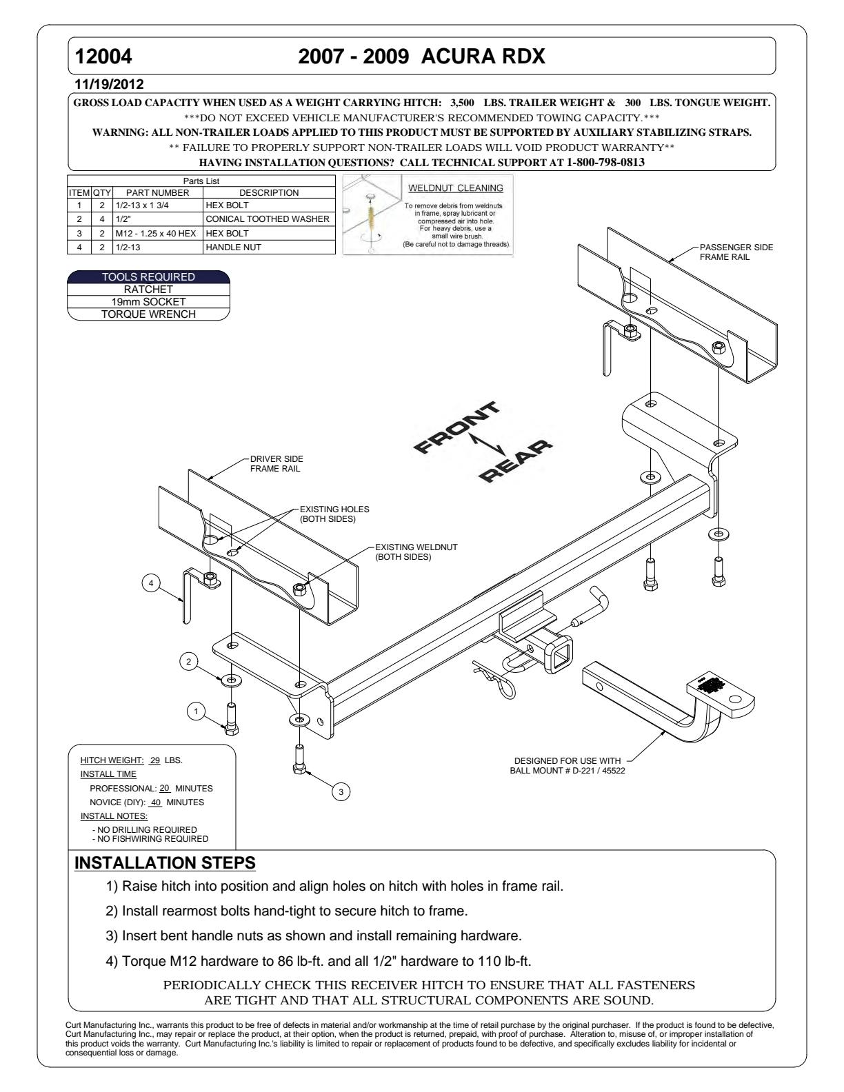 Whatever the next checkpoint is on your adventure -- whether it's getting your bike on the trail before sunrise or making it to the campground before dark -- CURT class 2 hitches let you Bring It with confidence. These receiver hitches are made to handle most light-duty towing applications and offer a custom fit for your vehicle. Typically used on full-size cars, crossovers, compact SUVs, minivans or even compact pickup trucks, a CURT class 2 trailer hitch complements the design of smaller vehicles. This particular class 2 hitch is made to be a custom hitch for certain years of the Acura RDX (to verify vehicle compatibility, see application info). It offers a weight carrying capacity of 3,500 lbs. GTW and 300 lbs. TW. Class 2 trailer hitches can typically be used to tow a variety of lightweight trailers, such as a small utility trailer, small fishing boat trailer or popup camper (NOTE: Never exceed the lowest weight capacity of any towing component). They are also perfect for adding cargo space to your vehicle with a bike rack or cargo carrier. This class 2 hitch features a 1-1/4" receiver tube to accept a ball mount shank or other hitch-mounted accessory. For safety, it is tested in accordance with SAE J684. A custom trailer hitch design requires extra care, and as such, CURT class 2 hitches are engineered using real vehicles and hands-on research. We use high-strength steel, robotic welding and rigorous testing to produce hitches that are built to fit your lifestyle. To ensure that each hitch will be a reliable extension of your vehicle, we also finish our hitches in a co-curing of liquid A-coat and black powder coat, giving them long-lasting rust and wear resistance.