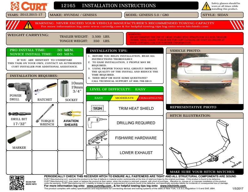 A CURT trailer hitch is the key to pursuing your passions, whether you're taking the family boat out for an afternoon on the water or packing up the mountain bikes for a day on the trails. This CURT class 2 hitch is perfect for towing a small trailer, such as a boat trailer, lightweight camper or utility trailer. It can also be used to mount a hitch cargo carrier or bike rack (never exceed the lowest-rated towing component). Like all CURT custom hitches, this class 2 trailer hitch is made for a vehicle-specific fit. It is engineered to seamlessly integrate with select years of the Genesis G80, Genesis G90 and Hyundai Genesis (see application info to verify fitment). It is rated for 3,500 pounds gross trailer weight and 350 pounds tongue weight. It is also equipped with 1-1/4" x 1-1/4" hitch receiver to accept the included ball mount. The ball mount that comes with this hitch kit has a 3/4" trailer ball hole and can be positioned in the drop or rise orientation for level towing with your specific trailer (trailer ball not included). Like all CURT custom receiver hitches, this class 2 hitch is designed, manufactured, finished and tested with the utmost care. It is engineered for a precise fit, easy installation, maximum towing strength and an integrated look on the vehicle. It is also tested to SAE J684 protocols for safety. This class 2 trailer hitch is finished with our industry-leading dual-coat process for unparalleled rust, chip and UV resistance. It is descaled for a smooth surface, submersed in liquid A-coat for rust prevention inside and out, covered with a highly durable powder coat, and finally co-cured for a dependable shield against the elements. This class 2 hitch comes with a ball mount, hitch pin and mounting hardware for a complete installation.