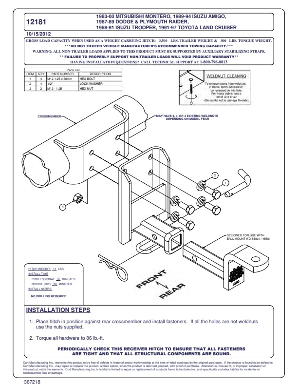 A CURT trailer hitch is the key to pursuing your passions, whether youre taking the family boat out for an afternoon on the water or packing up the mountain bikes for a day on the trails. This CURT class 2 hitch is perfect for towing a small trailer, such as a boat trailer, lightweight camper or utility trailer. It can also be used to mount a hitch cargo carrier or bike rack (never exceed the lowest-rated towing component). Like all CURT custom hitches, this class 2 trailer hitch is made for a vehicle-specific fit. It is engineered to seamlessly integrate with select years of the Dodge Raider, Isuzu Amigo, Isuzu Trooper, Mitsubishi Montero and Toyota Land Cruiser (see application info to verify fitment). It is rated for 3,500 pounds gross trailer weight and 300 pounds tongue weight. It is also equipped with 1-1/4 in. x 1-1/4 in. hitch receiver to accept the included ball mount. The ball mount that comes with this hitch kit has a 3/4 in. trailer ball hole and can be positioned in the drop or rise orientation for level towing with your specific trailer (trailer ball not included). Like all CURT custom receiver hitches, this class 2 hitch is designed, manufactured, finished and tested with the utmost care. It is engineered for a precise fit, easy installation, maximum towing strength and an integrated look on the vehicle. It is also tested to SAE J684 protocols for safety. This class 2 trailer hitch is finished with our industry-leading dual-coat process for unparalleled rust, chip and UV resistance. It is descaled for a smooth surface, submersed in liquid A-coat for rust prevention inside and out, covered with a highly durable powder coat, and finally co-cured for a dependable shield against the elements. This class 2 hitch comes with a ball mount, hitch pin and mounting hardware for a complete installation.