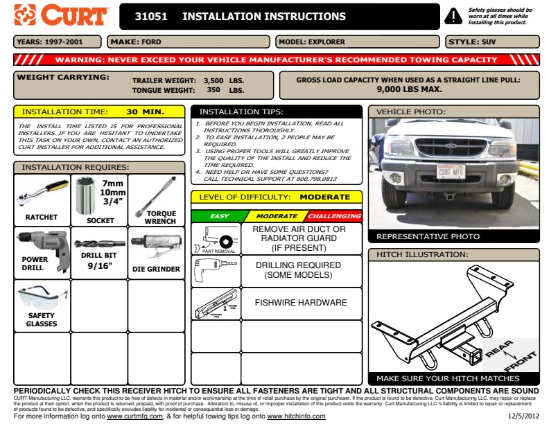 A CURT front trailer hitch allows you to use the front end of your vehicle for a variety of towing applications. They can be used for mounting a winch, a snow plow, a number of towing accessories and can even be used for some trailering applications. When space is limited, a front trailer hitch is commonly used to hold a cargo carrier, freeing up space inside the vehicle for extra cargo and making the rear mount receiver available to pull a trailer. At the boat ramp, your boat trailer can be hitched up to the front receiver hitch, giving you better control over the trailer as you launch. Some of the other accessories that can be used with a front tow hitch are the CURT winch mount, step pad, license plate holder, spare tire mount, skid shield and tow hooks. All CURT front trailer hitches provide a useful receiver tube to accept a 2 in. x 2 in. shank, and they are commonly used on trucks, vans and SUVs. This front trailer hitch is rated for 3,500 lbs. GTW and 350 lbs. TW. It also has a straight-line pull rating of 9,000 lbs. It is designed to be a custom trailer hitch for certain years of the Ford Explorer (to verify your vehicle compatibility, see application info). It comes with all necessary hardware for a complete installation and is backed by a limited lifetime warranty.
