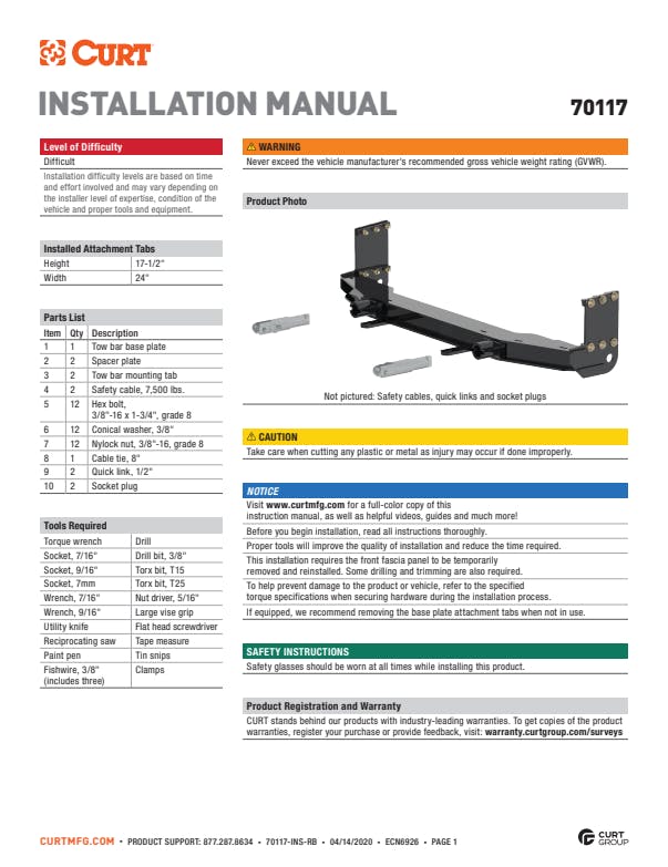 - Includes base plate, safety cables and installation hardware (tow bar sold separately)
