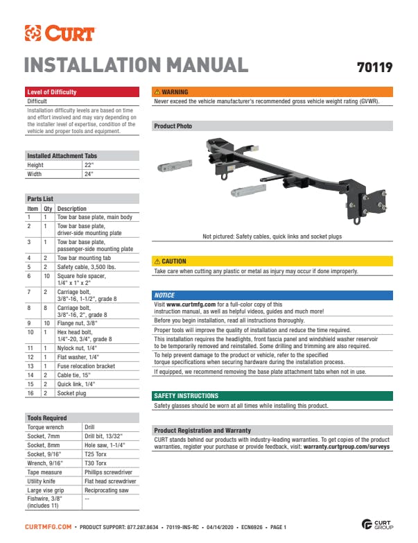 - Includes base plate, safety cables and installation hardware (tow bar sold separately)