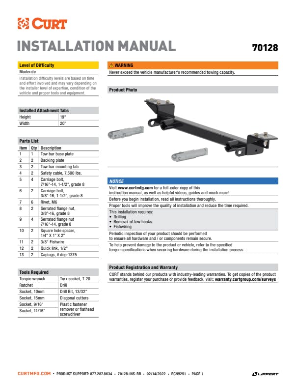 - Includes base plate, safety cables and installation hardware (tow bar sold separately)