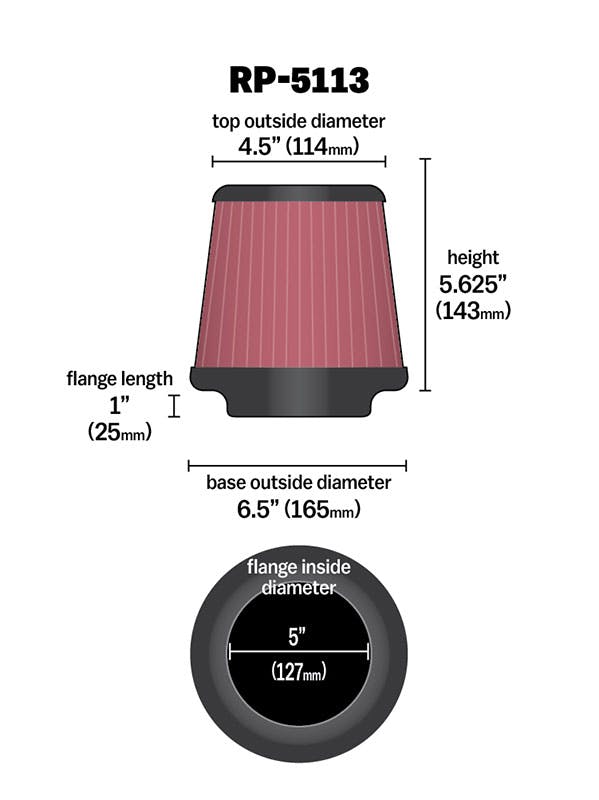 The RP-5113 Universal Air Filter is constructed from an oiled cotton filter media. It comes with a carbon fiber top for strength and durability. The carbon fiber element adds to the light-weight design and gives this filter a smooth glass like finish. The RP-5113 is a clamp-on filter that has an inside flange diameter of 5 inches and a flange length of 1 inch. The base is 6-1/2 inches and the filter height is 5-5/8 inches.