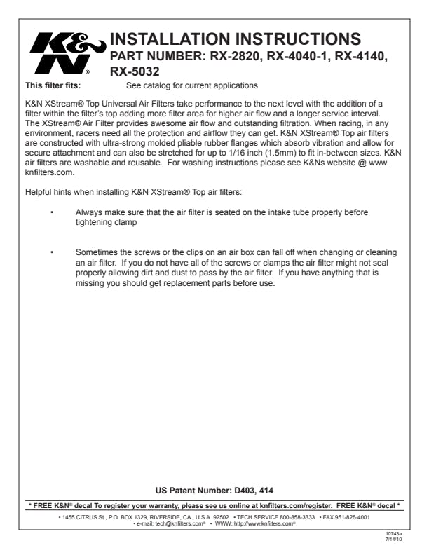 K&N's Universal Air Filters are designed and manufactured for a wide variety of applications including racing vehicles, radio-controlled cars, generators, snowmobiles, tractors, and other applications. Regardless of the angle or offset diameter of the air intake, there is probably a K&N Universal air filter for your equipment. All filters are constructed with ultra-strong molded pliable rubber flanges which absorb vibration and allow for secure attachment and can also be stretched for up to 1/16 of an inch (1.5mm) to fit in-between sizes. K&N universal air filters are washable and reusable.