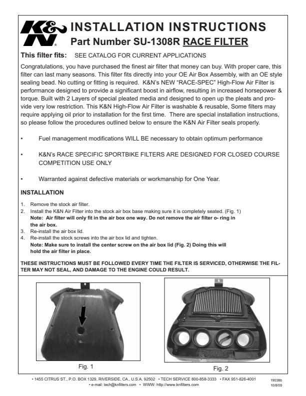 This K&N racing air filter has just two layers of cotton to provide even lower air restriction than our replacement air filter for street vehicles. Unlike K&N replacement air filters, fuel management modifications will be necessary with this racing filter. K&N racing air filters are washable and reusable and come with a one year limited warranty. This product is for closed course competition use only.
