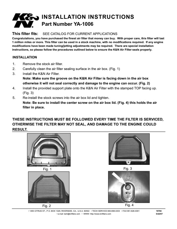 K&N's high-flow air filters are available as a replacement for your stock motorcycle air filter element. They are custom engineered to fit your specific application and are designed to provide low restriction and increased performance, while providing excellent engine protection for your motorcycle.