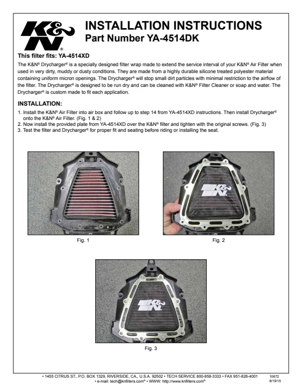The K&N Drycharger is a silicone treated, polyester wrap that is made to cover K&N Air Filters or Personal Watercraft Flame Arrestors. These Drychargers, which are similar to the K&N Prechargers, contain uniform micron sized openings that allow high air flow. Yet, due to the Drychargers silicone treated polyester wrap, the amount of water that reaches the air filter or flame arrestor is limited.